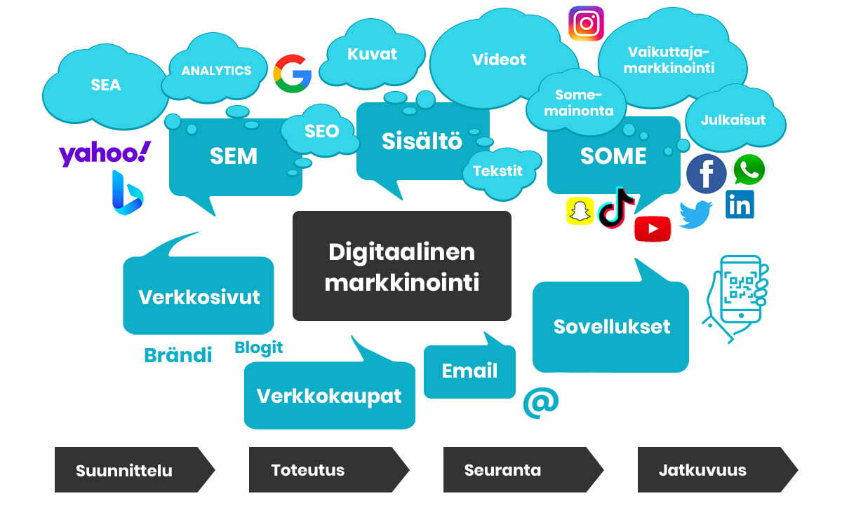 Edellä mainitut kategoriat kätkevät sisälleen useita eri haaroja, joiden kautta digitaalinen markkinointi voidaan saada virtaamaan.